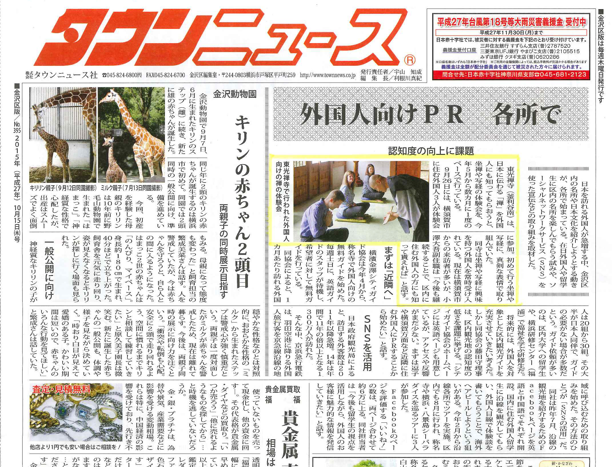 タウンニュース社発行、タウンニュース横浜市金沢区版10月15日号にて、東光禅寺「外国人向け禅体験プログラム」に関する記事が掲載されました。
